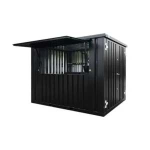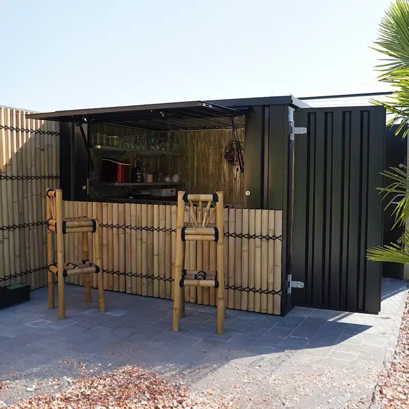 De XL antraciete bar container is uitgerust met een luifel die open en dicht is te klappen en op slot te zetten waardoor het veilig is om de bar container te laten staan met de spullen erin. Verder zit er een dubbele deur aan de korte zijde is. Hierdoor kunnen er ook grote dingen naar binnen zoals biervaten. Op deze manier is dus de ideale manier om bezoekers of vrienden van een drankje te voorzien. Een eenvoudige maar stevige barcontainer.